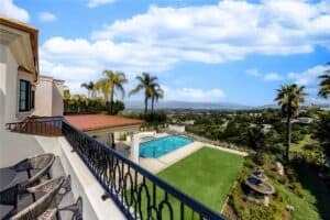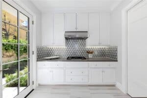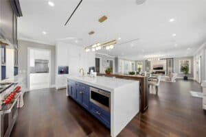 The gourmet kitchen is a culinary masterpiece, featuring Sub-Zero and Wolf appliances, an oversized waterfall island, and custom cabinetry. An adjacent prep kitchen ensures ease for both daily living and hosting large gatherings.